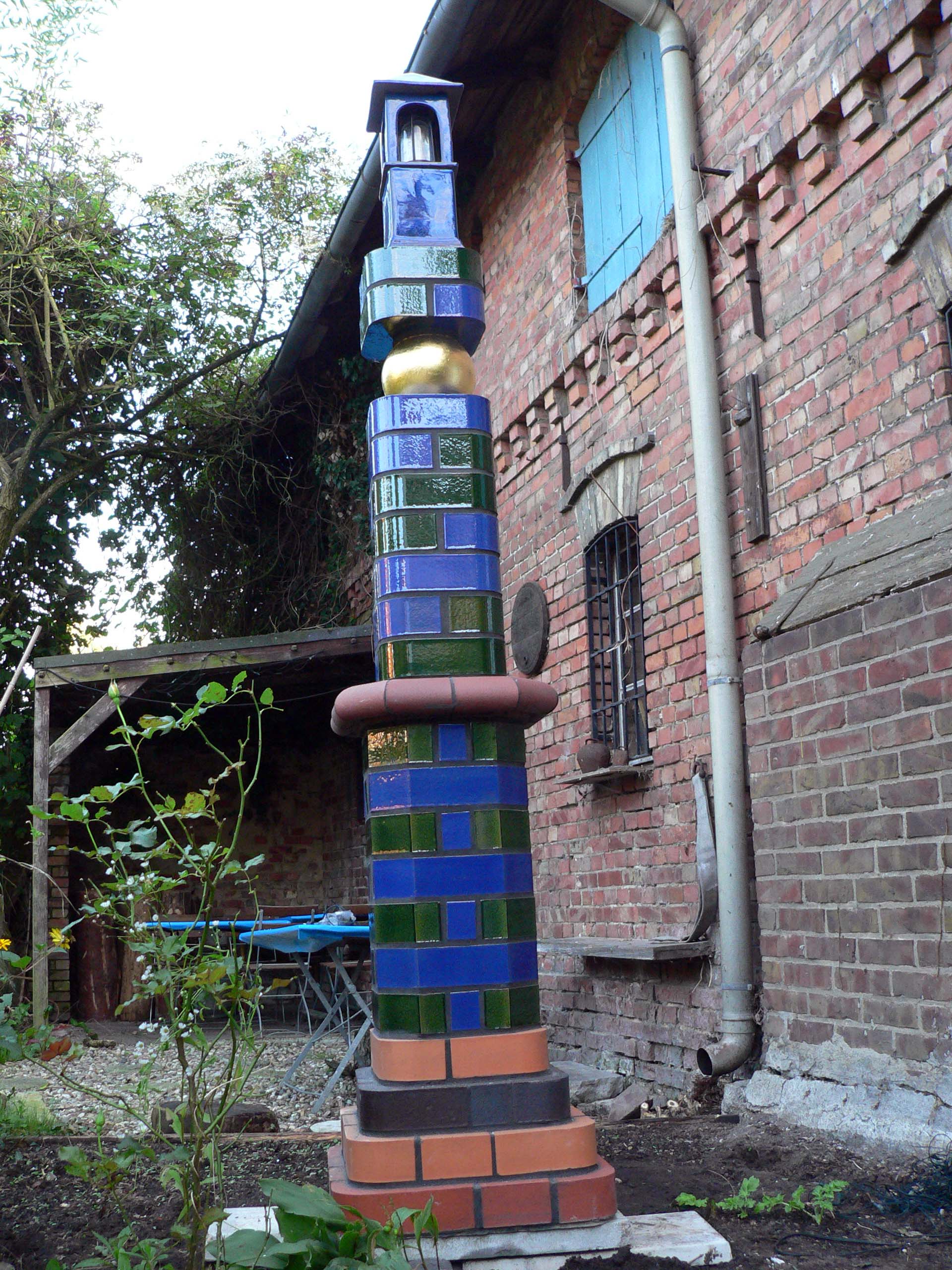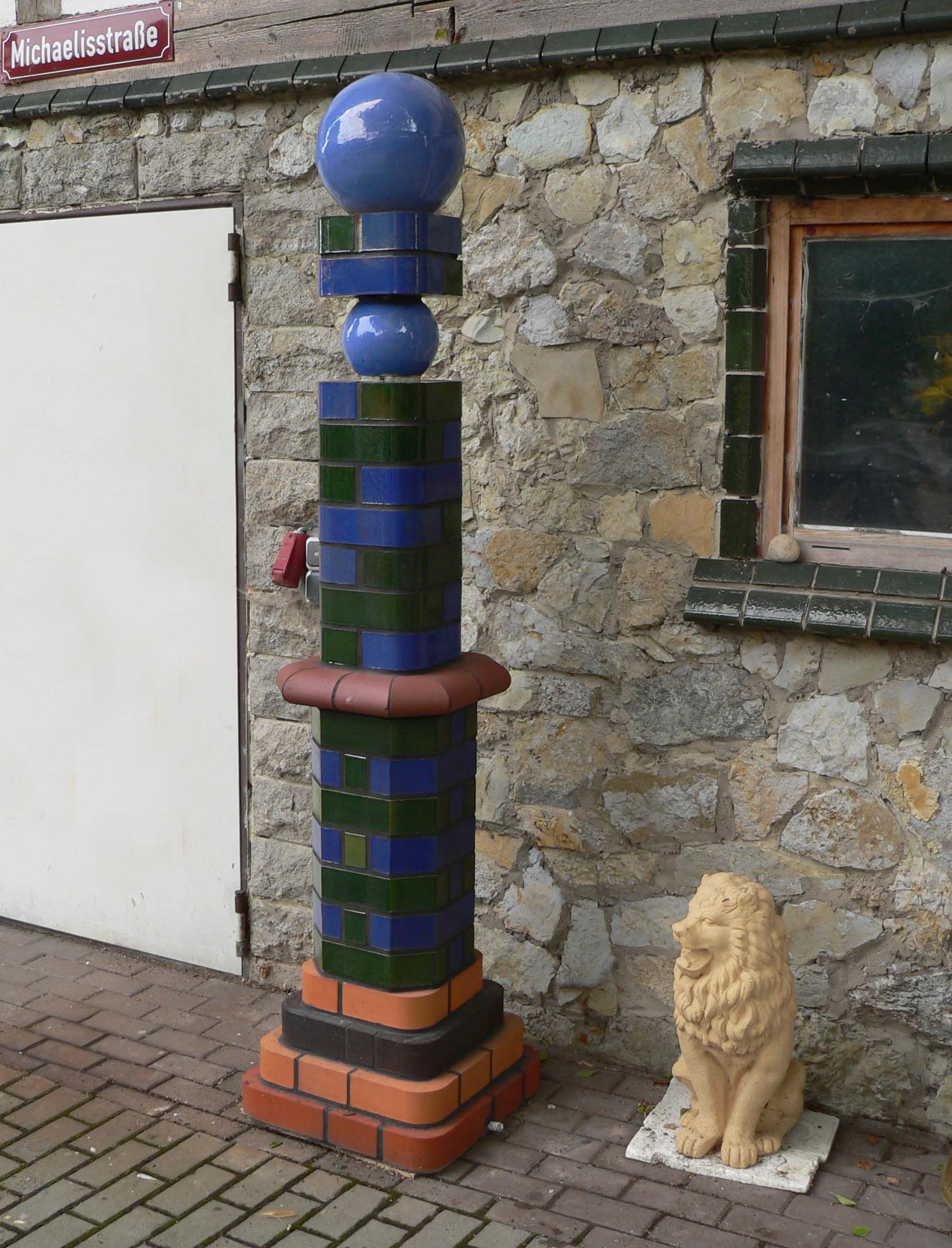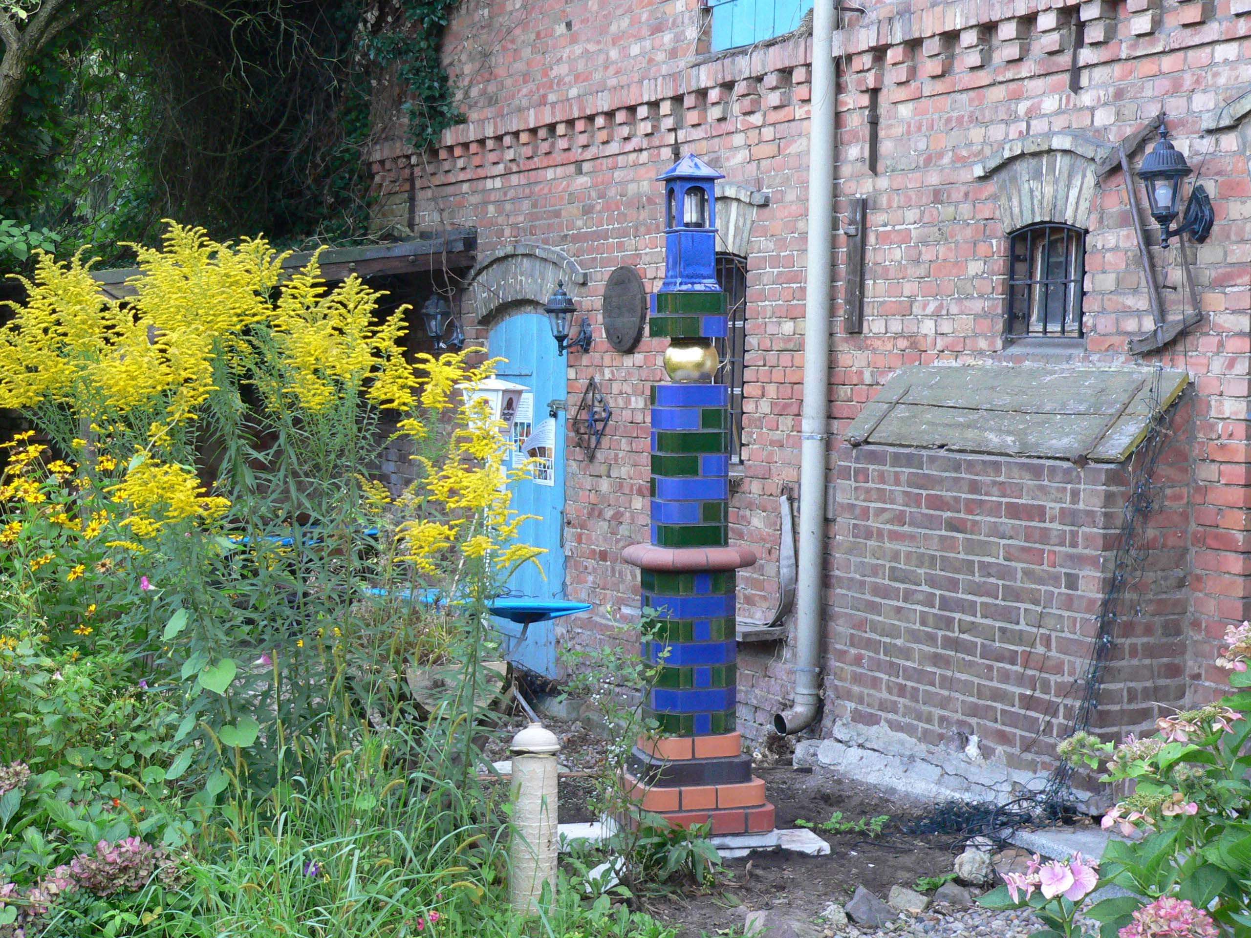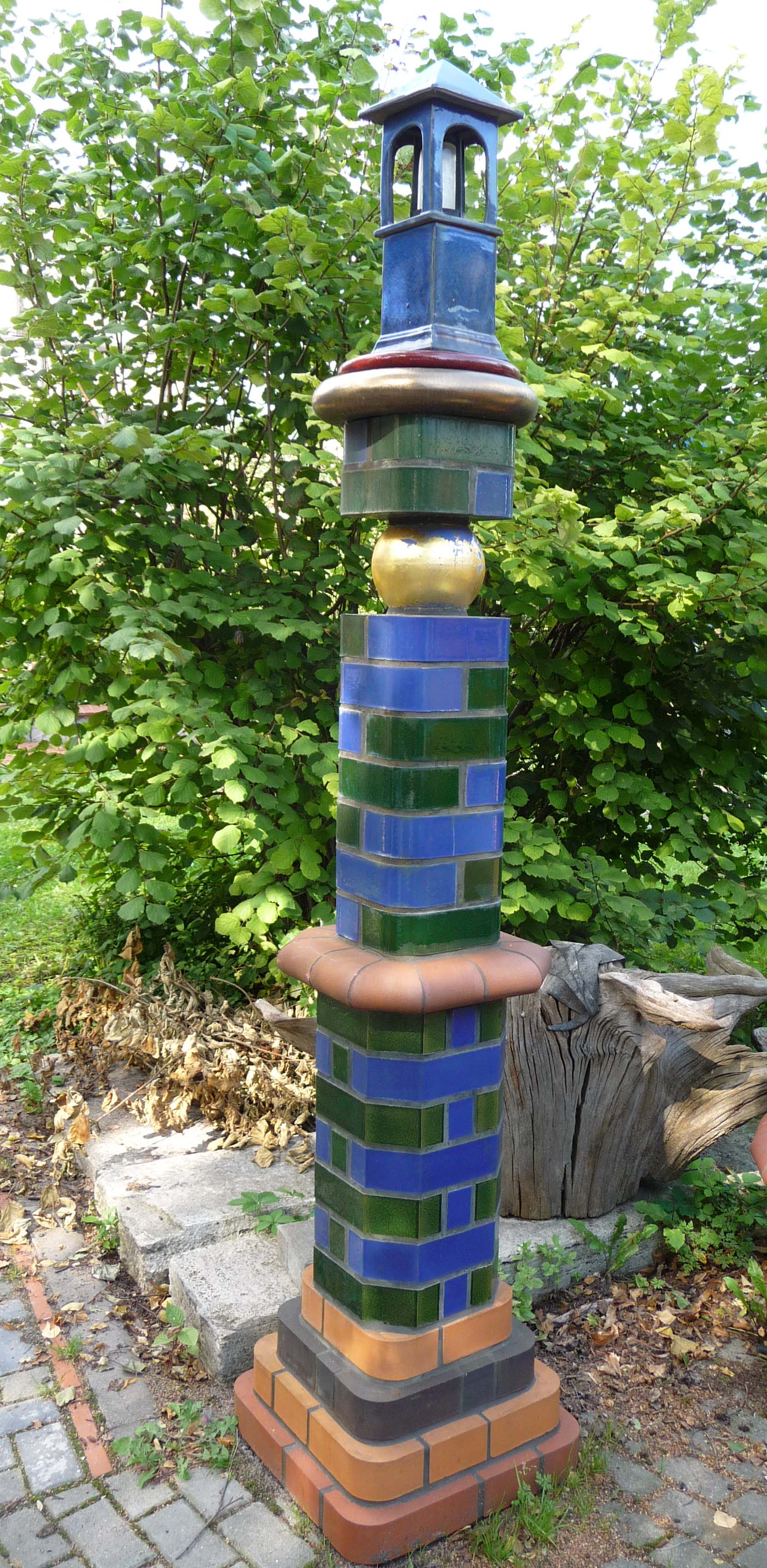 Diese Säule - birgt sie ein Geheimnis? Mit ihren dunkelgrünen und dunkelblauen glasierten Klinkern, die sich wie zwei Bänder an der Säule hoch winden, steht sie majestätisch, glänzend und doch sehr geheimnisvoll da.