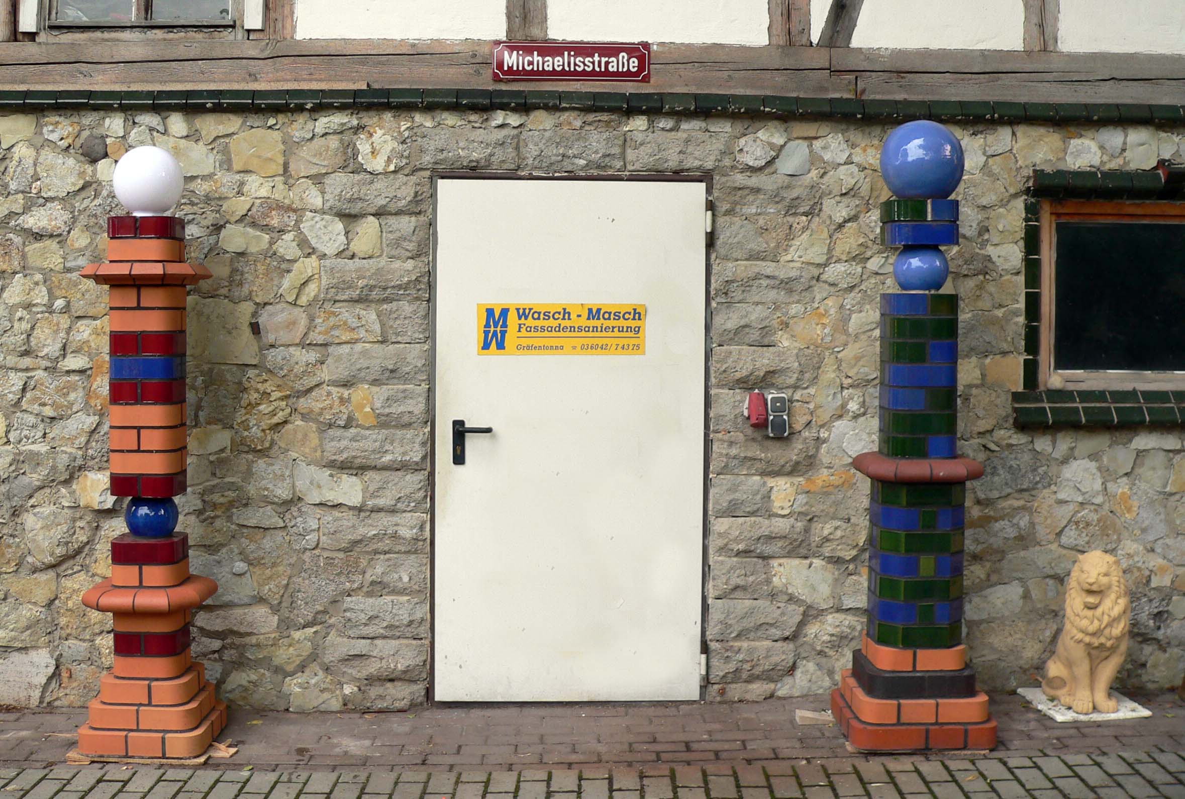 „Geerdet“ ist sie durch ihren brauen nicht glasierten Sockel und den schmalem brauen Gesims mittig der Säule.
