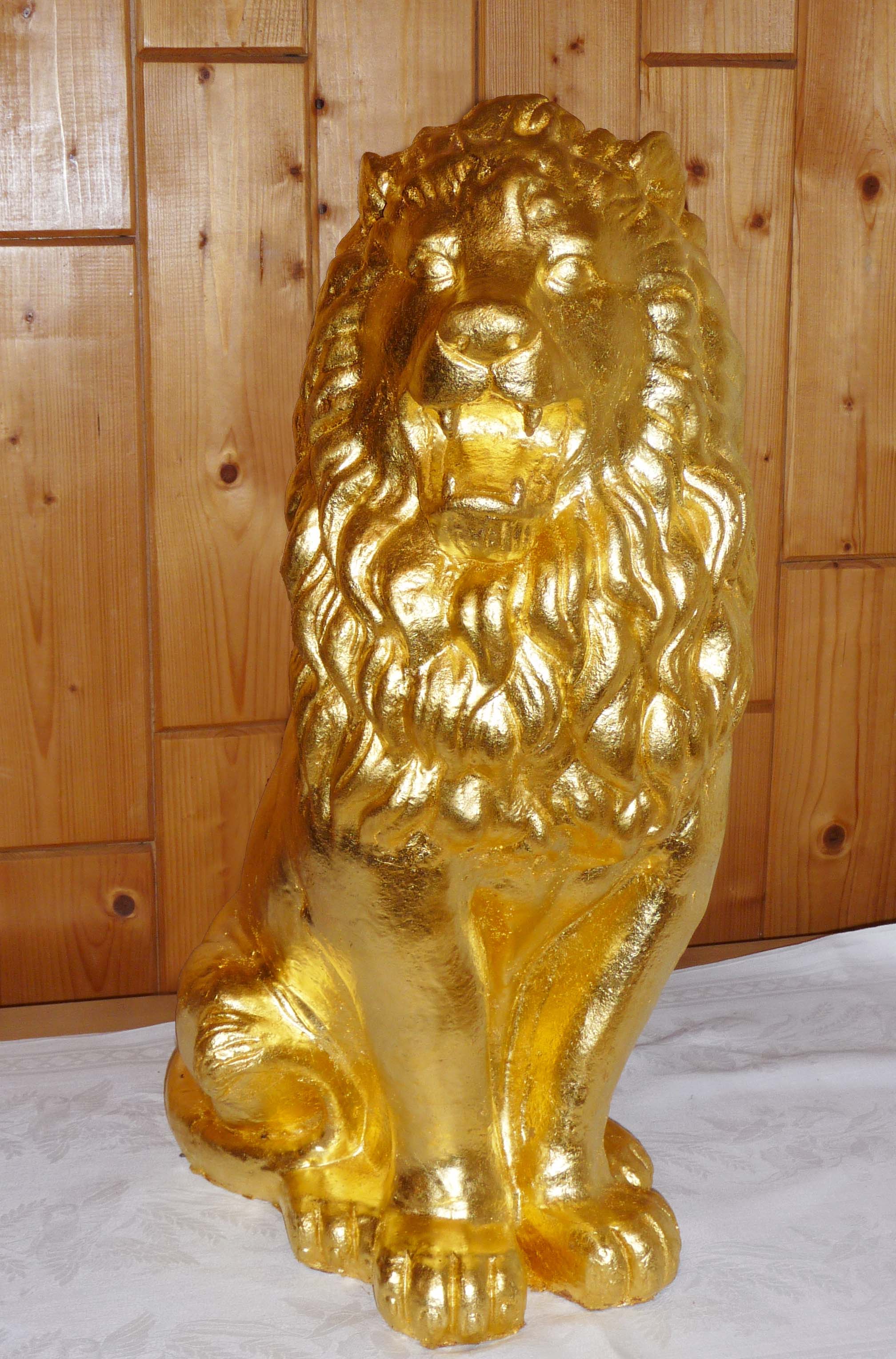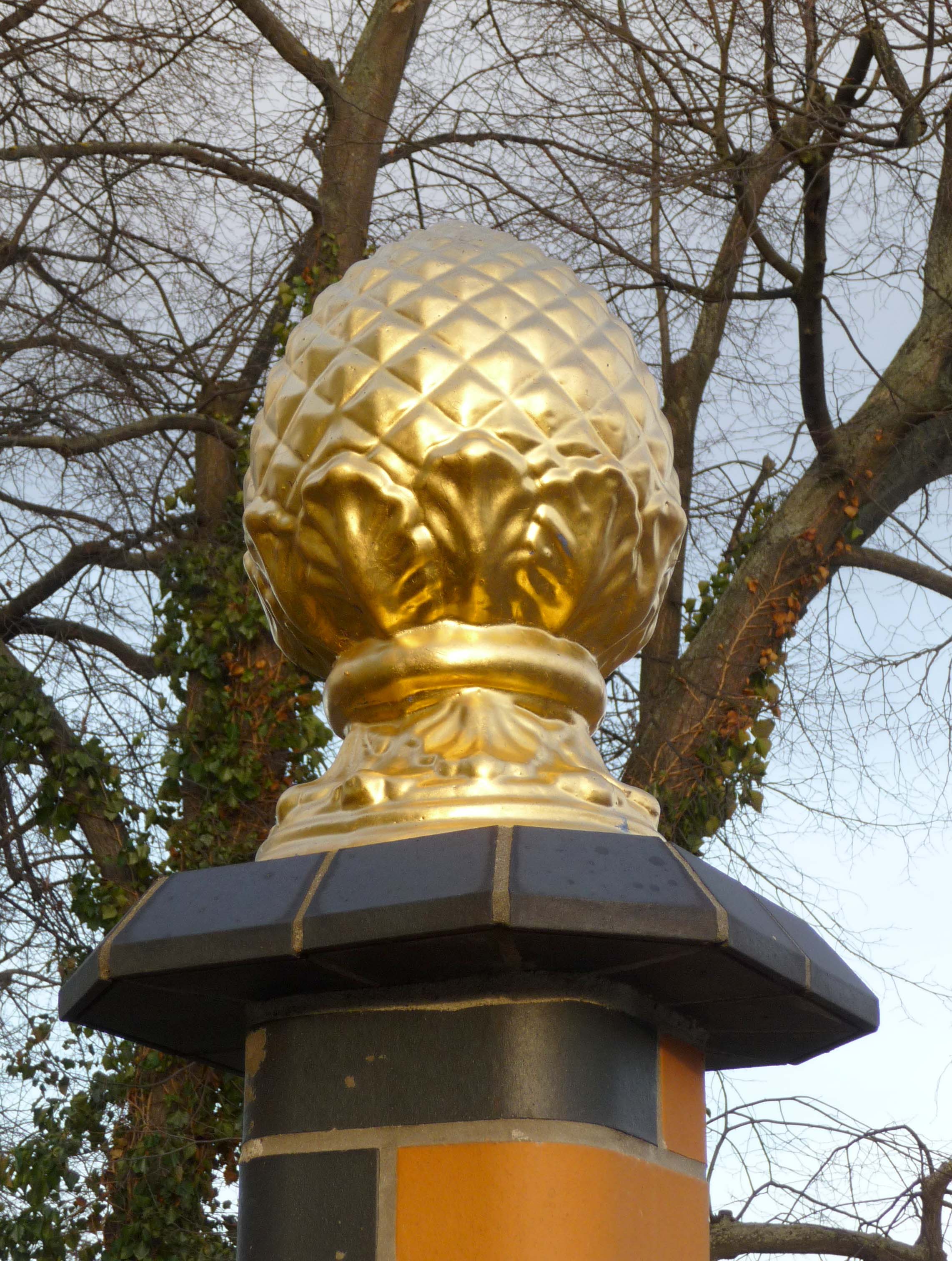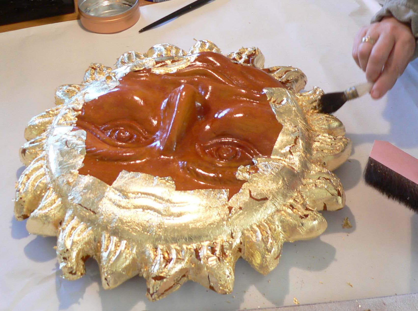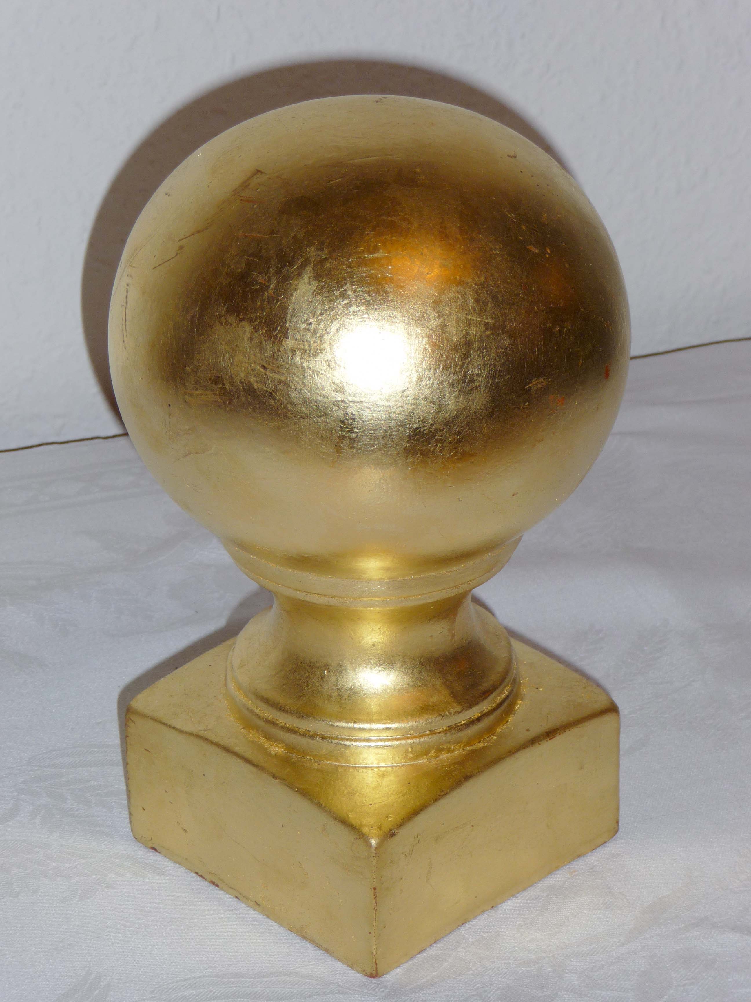 Nahezu alle Elemente einer Thür-Säule können vergoldet werden. Die Vergoldung erfolgt im eigenen Atelier. Dabei wird mit Blattgoldauflage von 23.75 Karat gearbeitet, weil nur der große Goldreinheitsgrad der Witterung standhält. (24 Karat ist reines Gold)